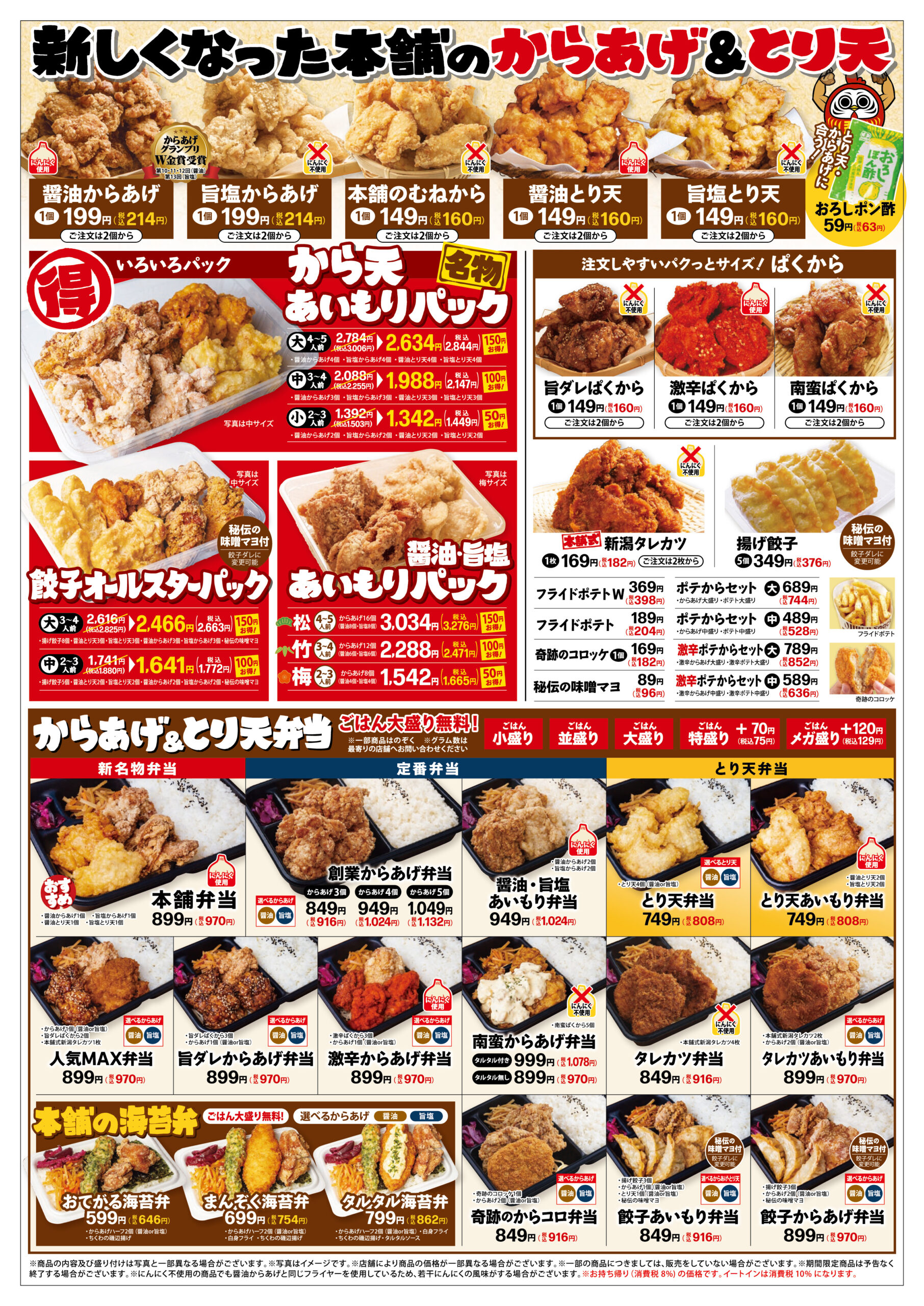 HOME > メニュー紹介 > メニュー:新(2/28~) メニュー 元祖からあげ本舗、自慢のメニューをご紹介! 定番メニュー(2/28~) ↑メニューを拡大する(PDF) ※店舗により取り扱いがない場合や価格が異なる場合がございます、または品切れの場合がございます。 アレルギー情報(PDF) からあげの温め直し方 author