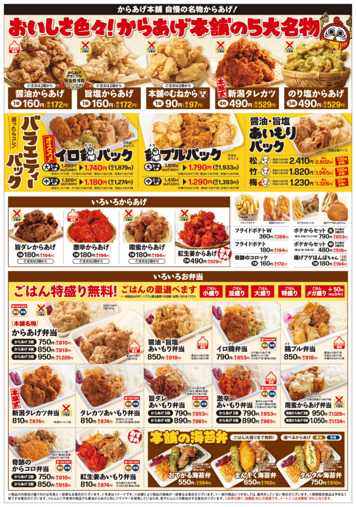HOME > メニュー紹介 > メニュー:S (11/1~) メニュー 元祖からあげ本舗、自慢のメニューをご紹介! 期間限定メニュー(11/1〜) ↑メニューを拡大する(PDF) ※店舗により取り扱いがない場合、または品切れの場合がございます。 定番メニュー ↑メニューを拡大する(PDF) ※店舗により販売メニュー、価格が異なります。 アレルギー情報(PDF) からあげの温め直し方 author