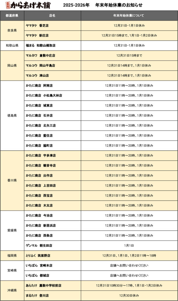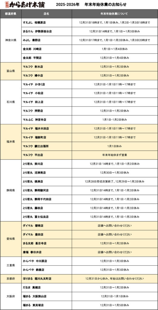 からあげ本舗全店舗、年末年始のお休みについてお知らせです。